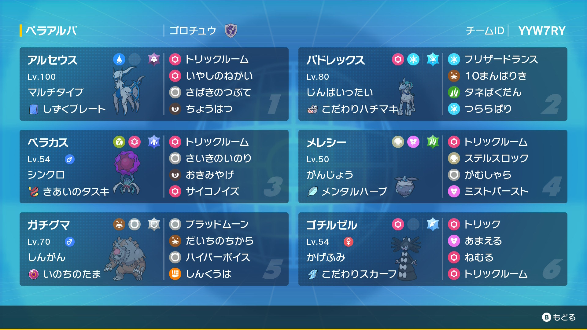 その場合の立ち回りは、メレシーorアルセでトリル&退場→アタッカーが攻撃→アルセorメレシーを後出ししてトリル&退場→再度アタッカーが攻撃となります